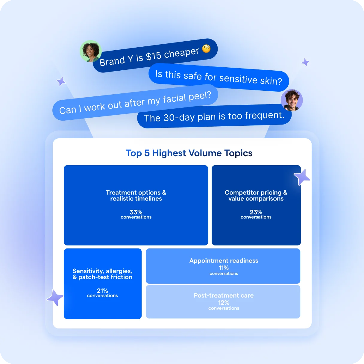 The Topics Dashboard automatically surfaces what customers are talking about across every channel, all in one place.